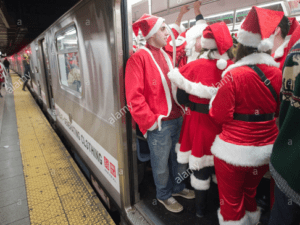 As I positioned myself (like any true New Yorker) in just the right place where the car and doorway will stop, I noticed everyone around me appeared to have the same mood swing– tired, frustrated, and just ready to get home. When the train stopped in front of us and the doors open, those of us that were waiting stepped to the side to allow the riders to come out. Suddenly one Santa appears, which was fine and no big deal. But then two, three, four… than 10 appeared right behind him. Then twenty more, from every car. Also include some elves, Santa helpers, and Christmas carolers all around. It was winter wonderland for a few seconds in the station!!
